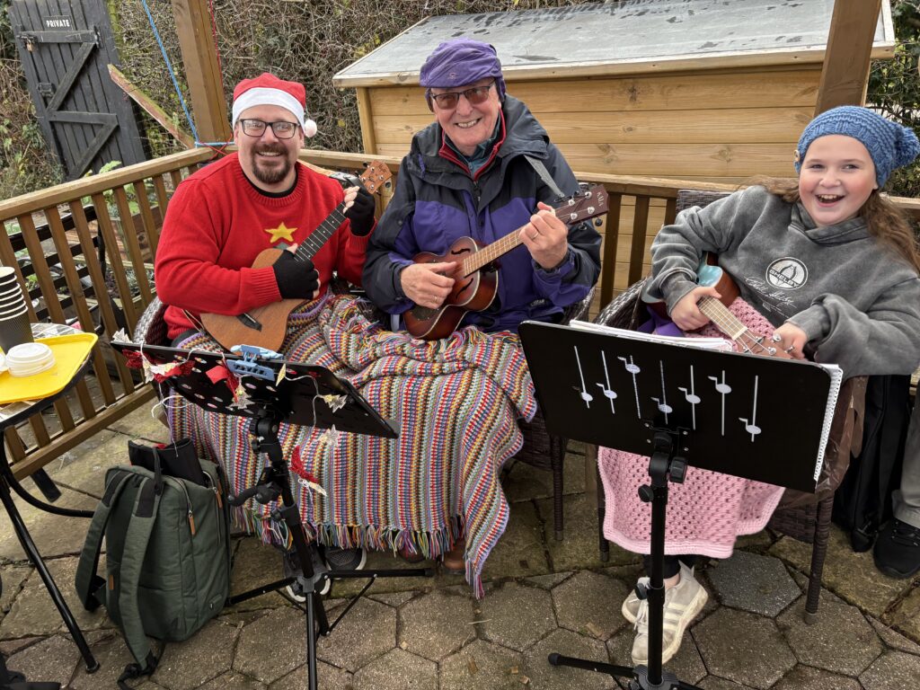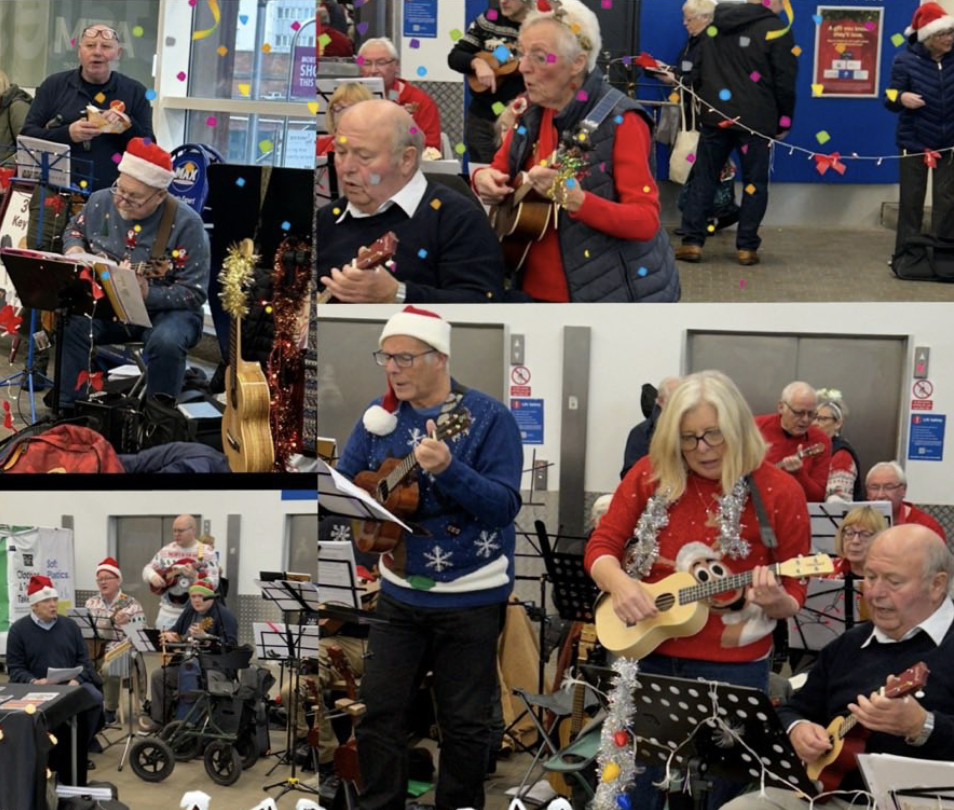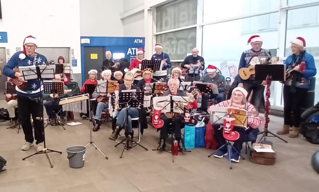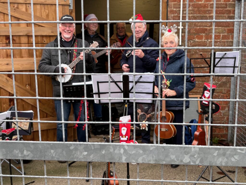 It seemed very appropriate to sing Christmas songs in a stable at Bryson’s Animal Shelter Christmas Fair. There was the added bonus of shutting the stable door before the strummers bolted! – or perhaps that was the audience.